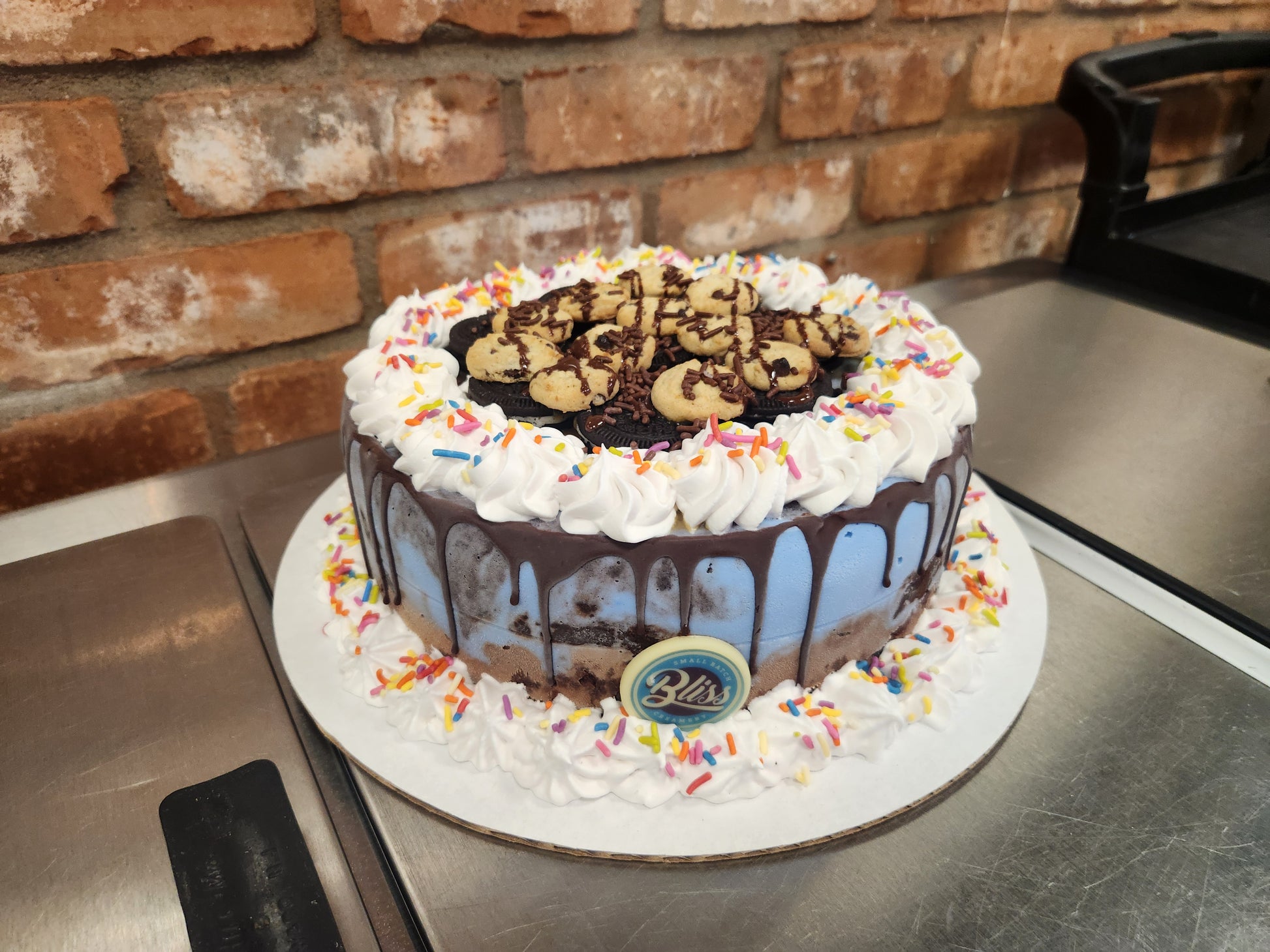 **REQUIRES AT LEAST 24 HOURS ORDERING NOTICE**Your cake, your way! Our custom ice cream cakes are designed by you—crafted to match your favorite flavors and perfect for any celebration. Choose up to two of your favorite Bliss ice cream flavors for the base, then top it off with your choice of delicious drizzles, toppings, and decorations. Whether you go classic, colorful, or completely over the top, this cake is all about what you love.