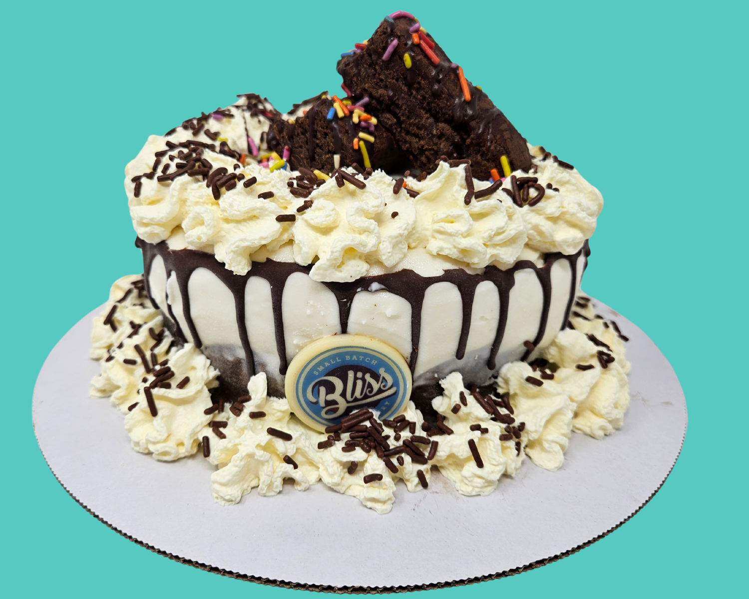 **REQUIRES AT LEAST 24 HOURS ORDERING NOTICE**Dressed to impress and ready to party! This indulgent cake features a perfect pairing of two classic flavors—our rich, chocolatey Fudgy Brownie ice cream and smooth, creamy Honey Vanilla. It’s dripped and drizzled with decadent chocolate, then topped with gluten-friendly brownie fingers, chocolate sprinkles, and a pop of rainbow sprinkles for extra flair. Elegant, playful, and completely delicious—just like a tuxedo should be.